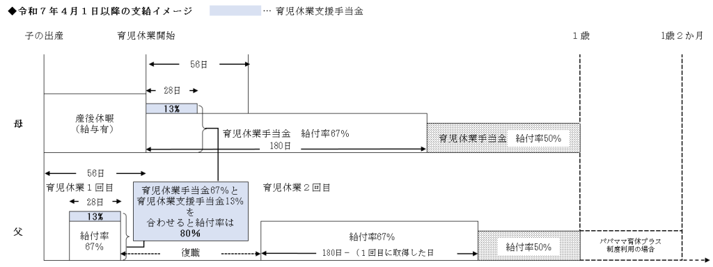 育児需要の高い時期である子の出生後一定期間内に両親ともに育児休業等を取得することを促進するため、原則として、両親ともに週休日を含む通算14日以上の育児休業等を取得した場合、最大28日間(28日には週休日を含みますが、給付は週休日を除く。以下同じ。)、1日につき標準報酬の日額の13%に相当する金額を育児休業手当金に上乗せして支給します。