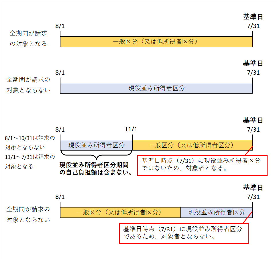 なお、基準日(7月31日)までの自己負担限度額の区分が「現役並み所得者」であっても、基準日(7月31日)時点の自己負担限度額の区分が「一般」又は「低所得者」であれば対象となりますが、「現役並み所得者」の期間の自己負担額は含みません。