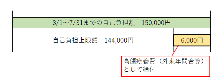自己負担額合計150,000円-外来年間上限額144,000円=高額療養費(外来年間合算)6,000円を給付