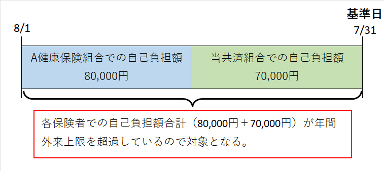 ※計算期間(8月1日から7月31日まで)の途中で保険者が変わっても、各保険者の期間での自己負担額合計が外来年間上限額を超過している場合は、給付対象となります。